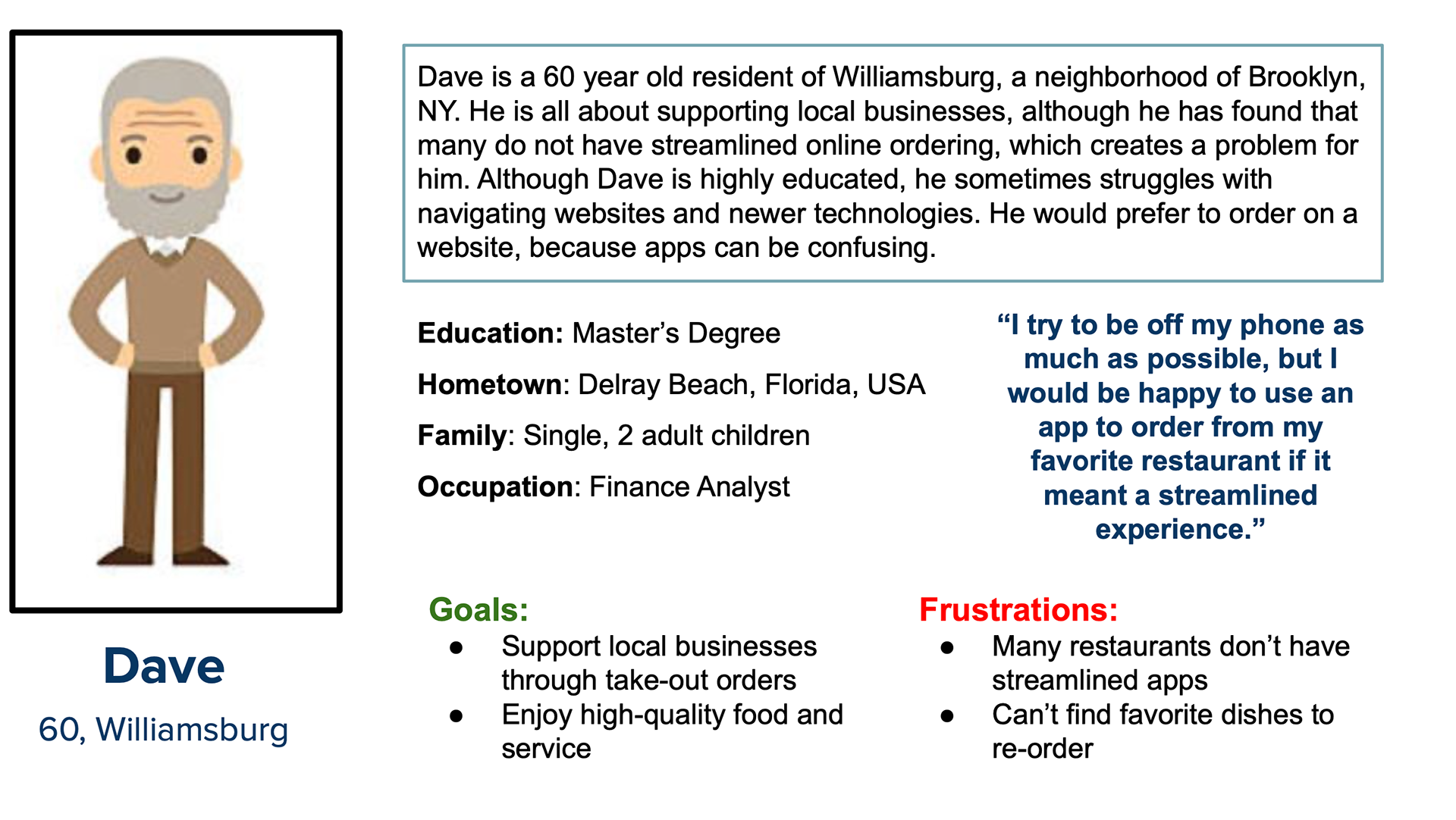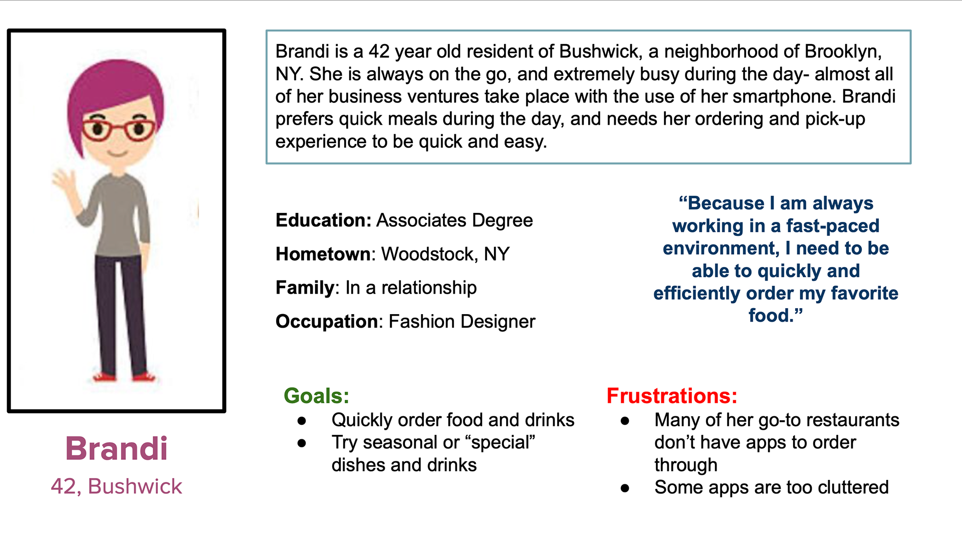 Create a restaurant app where customers can browse the menu and place orders easily, with a focus on accessible and clean UI. The diversity of Brooklyn neighborhoods makes for a wide range of user backgrounds (see personas below), meaning that the app will need to be simple and streamlined.