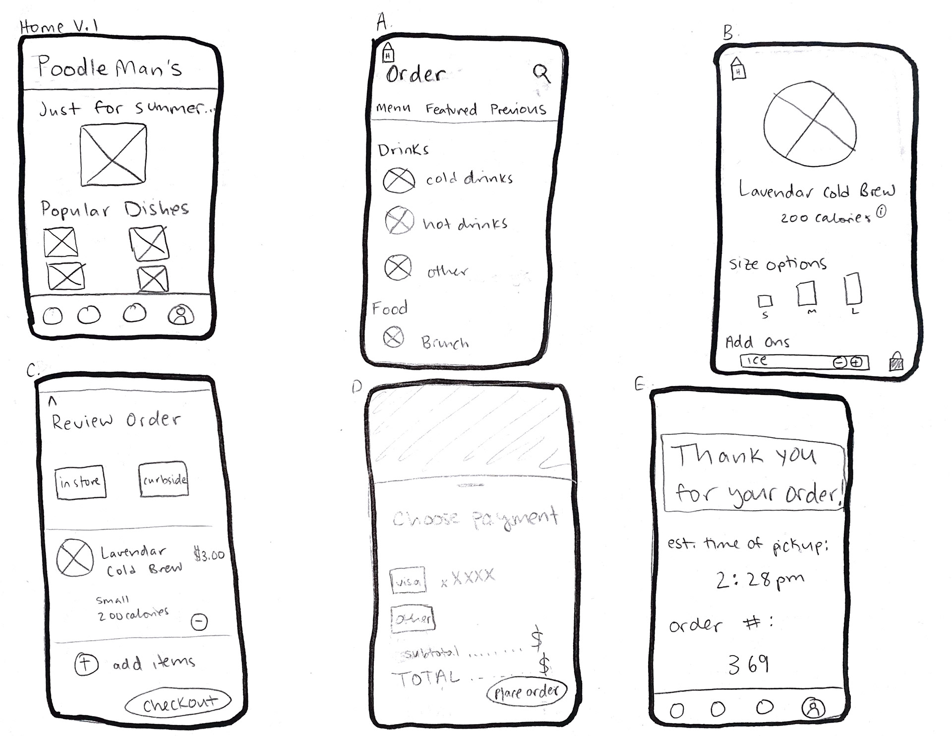 I defined the flow and what screens were needed, then proceeded with creating the wireframes to explore the experience in more detail on a screen-by-screen level. The main focus was a quick ordering experience, which I tried to emulate through making the menu and past orders/favorites easily accessible, and streamlining the payment process.