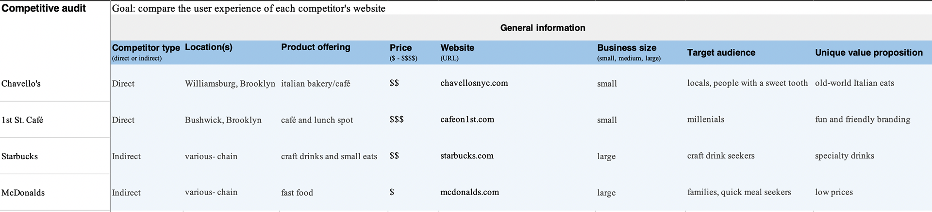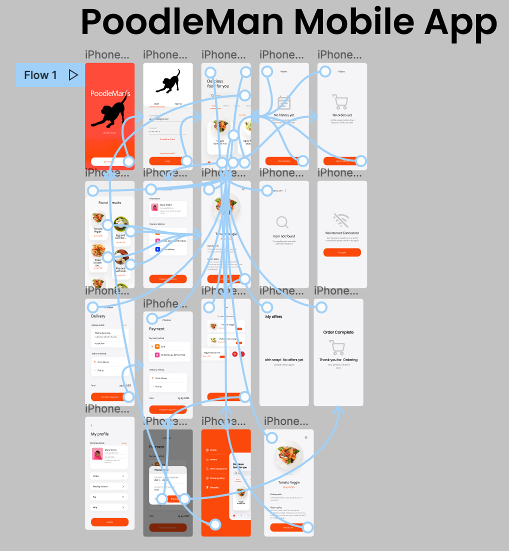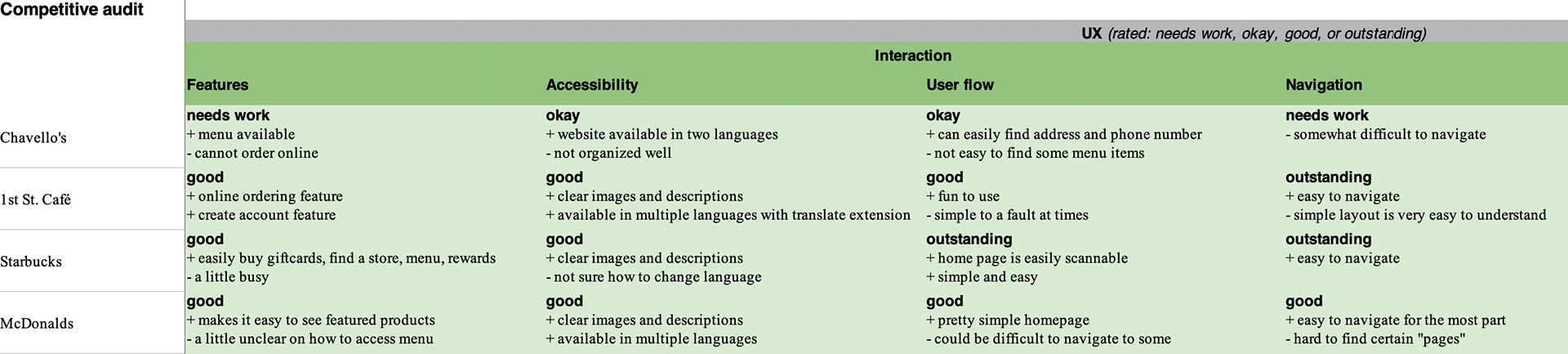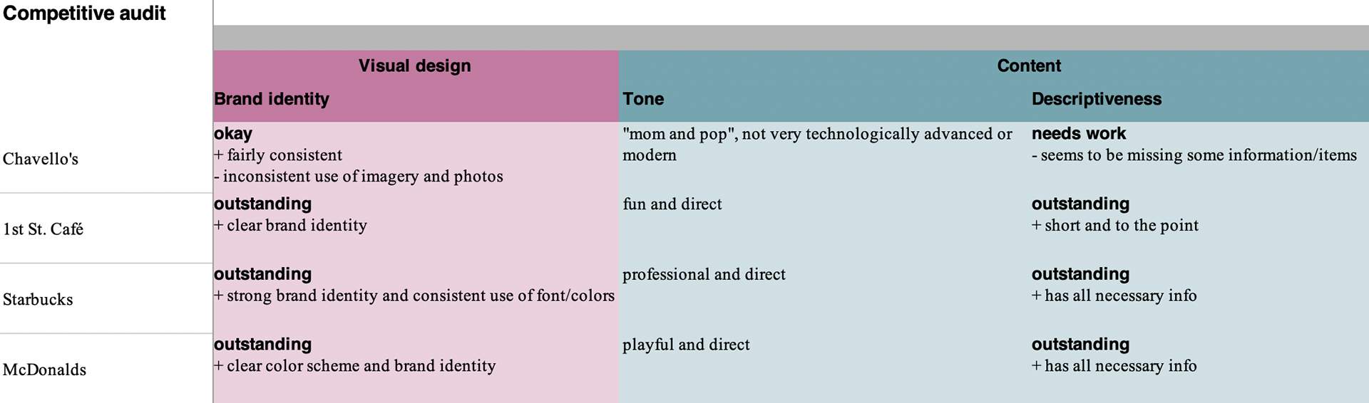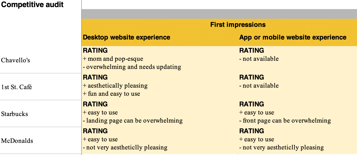 For the competitive audit, I researched aspects of different restaurants and their interfaces (for the purpose of this demonstration, some are made-up restaurants). It was very important for me to research and record the features and layouts of apps or websites that I found very easy to use- this is the main goal of PoodleMan's app.